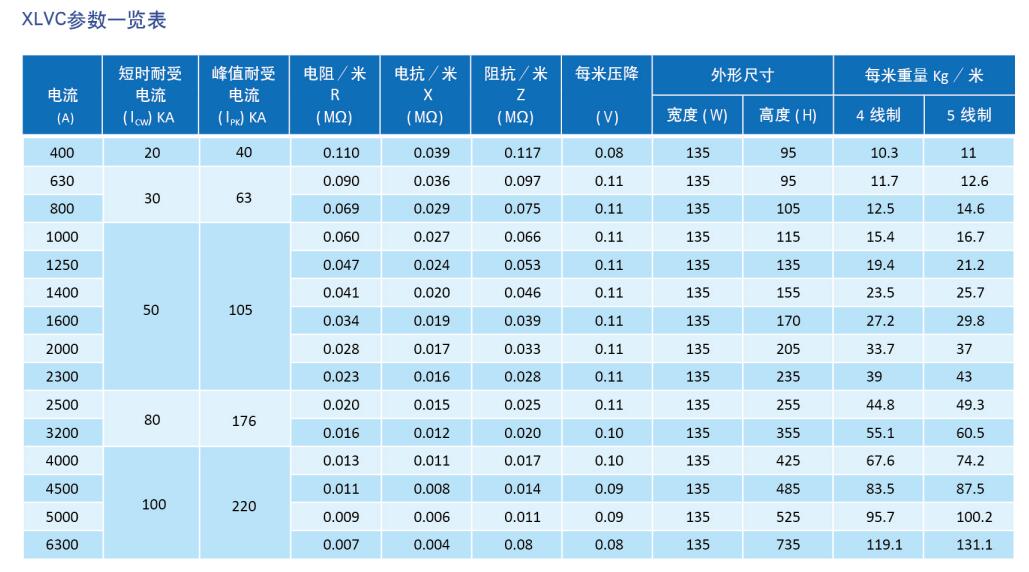 带插接口母线槽性能及技术参数,XLV为密集型结构,内部导体采用了新型整体包覆工艺绝缘,相互叠装成紧凑结构。模制铝合金封闭外壳具有优异的抗腐蚀、散热性,可直接作为100%接地导线使用,该结构可有效均衡各阻抗,从而极大减小母线槽系统的电压损失。